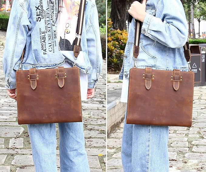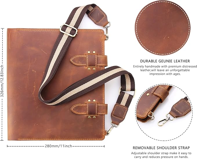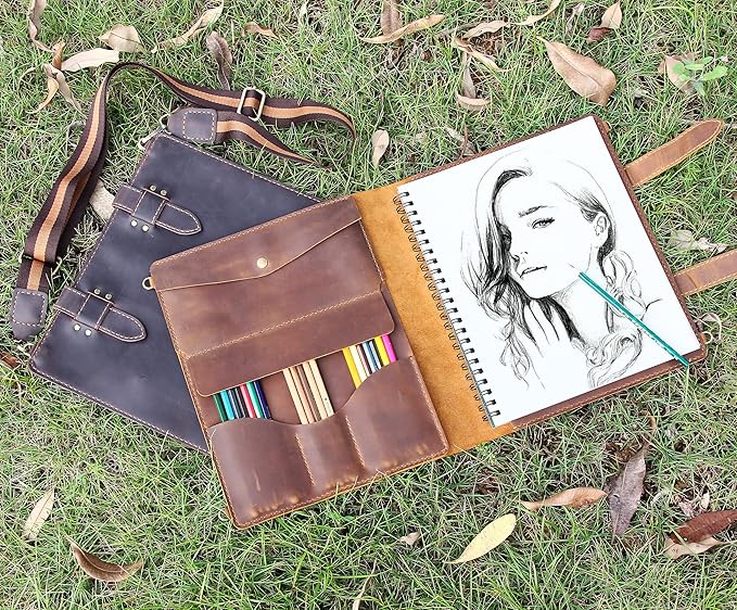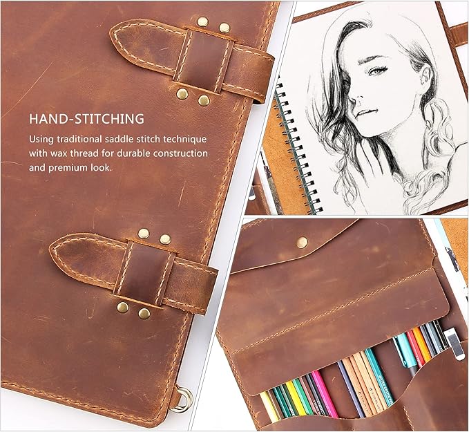 BEAUTIFULLY HANDCRAFTED - This is a beautifully crafted and versatile sketchbook cover is entirely handmade from high-quality distressed genuine leather for durability and a premium feel. Over time the leather will develop a unique patina. Meanwhile, manual stitching with waxed thread complements to the retro vibe and provides enhanced durability. PLENTY STORAGE SPACE - The leather sketchbook cover fits 9”x12” sketchbook or notebook at the right side pocket. Furthermore, The left side of the cover features 3 pencil pockets that can holds about 26-28 pencils, the top of pen pockets has a flap to protect pencils from damage. And a large pocket to keep markers, erasers, notes, stickers, and a lot of other things for the artist, designer. The interior large pocket on the left is designed to documents, cellphones, extra refills, and more. SHOULDER STRAP DESIGN - This leather drawing book cover features two leather strap closure keeps it closed when you’re on the go. And a shoulder strap for easy to carry your sketchbook cover case. PERFECT SIZE - Measures 11"x12.8" when folded and closed, perfect fit for 9” x 12” sketchbook or notebook. TREASURED GIFT - This handmade sketchbook case is the perfect gift for artists who love taking both their art and inspiration wherever they go.