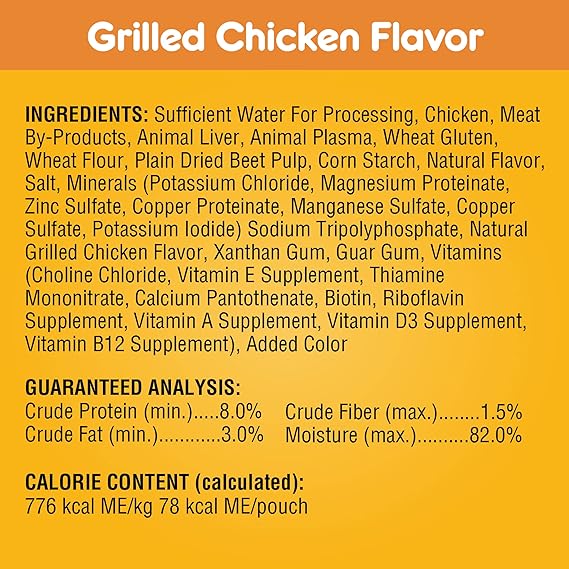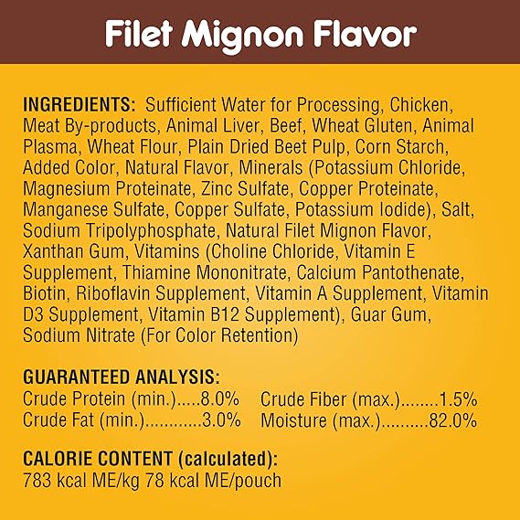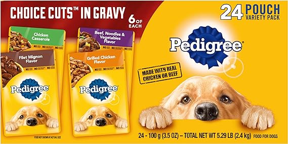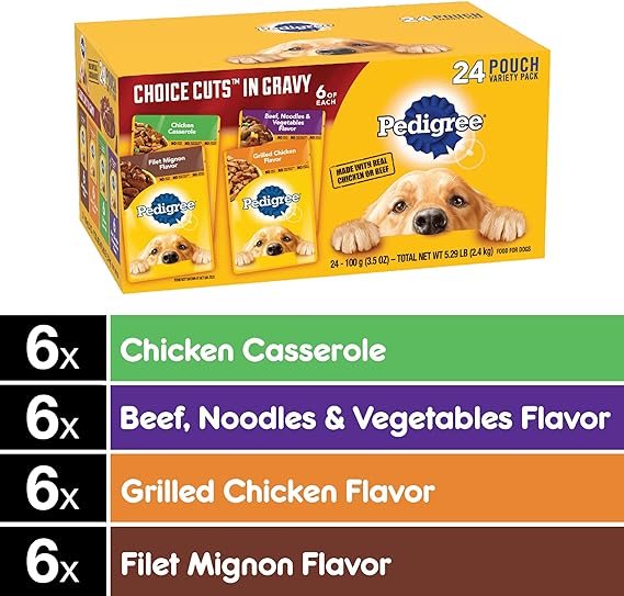 VARIETY PACK CONTAINS TWENTY-FOUR (24) 3.5 oz. pouches of PEDIGREE CHOICE CUTS IN GRAVY Adult Dog Wet Food: (6) Filet Mignon Flavor (6) Chicken Casserole (6) Grilled Chicken and (6) Beef Noodle & Vegetable Flavor 100% COMPLETE AND BALANCED for adult dogs MADE WITH REAL CHICKEN OR BEEF for a taste your dog will love with no added sugar, no high fructose corn syrup, and no artificial flavors SERVE as a topper, a mixer with dry dog food, or as a complete meal MADE IN facilities committed to zero waste to landfill