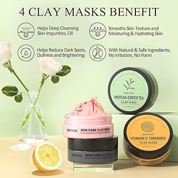 【TRAVEL SIZE CLAY MASK SET】- A super excellent clay mask for face with natural and safe ingredients for all skin types ! Vitamin C Turmeric Face Mask, Green Tea Mask, Dead Sea Mud Mask and Rose Clay Mask 4 in 1 mud mask kit with beautiful packaging is a great gift for anyone and also be a self-care gift. 60g each bottle, 240g in total, this facial skin care product is a super great value for your purchase. 【TURMERIC VITAMIN C CLAY MASK】- This vitamin c face mask is natural, vegan and cruelty-free, so you can use them with confidence! Vitamin C has the ability to stimulate collagen production, which helps improve facial complexion and rejuvenate skin with a natural glow. The turmeric content in the mask helps to lighten dark spots, reduce blemishes, smooth out fine lines on the skin, and increase skin elasticity for a firmer look. 【DEAD SEA MUD MASK】- This beauty skin care face mask helps to cleanse the skin and provide a soothing sensation. Enriched with minerals and high quality dead sea mud, it helps to renew the skin and gently purifies and cleanses clogged pores. It removes excess oil, toxins and dead skin cells from the skin, leaving it softer and more radiant. Facial skin care is necessary for daily life and for best results, use clay masks for a long time to get cleaner and smoother skin. 【GREEN TEA FACE MASK】- This deep cleanse face mask set utilizes the powerful minerals in natural green tea extract for deep detoxification, expelling toxins and impurities, toning and moisturizing the skin for a flawless complexion. Regular use of green tea detox face mask can achieve a significant antioxidant effect, and persistent use will find that the green tea detox mask plays a perfect role in slowing down the aging process. 【ROSE PINK CLAY MASK】- Moisturizing rose mud mask contains rose and advanced active ingredients improves signs of skin aging, pores, brightens the complexion while nourishing the skin and preserving the skin's internal moisture, leaving your skin feeling clear and refreshed. We aim to provide you with a perfect online shopping experience, if you are not satisfied with our skin care mask kit for any reason, we will solve it for you as soon as possible, please feel free to contact us. 【100% SATISFACTION 】- Please assure that we always stand behind our clay mask set. Should you for any reason be unhappy with your purchase, we provide you 24/7 customer support, please feel free to contact us. We will do our best to resolve your issues.