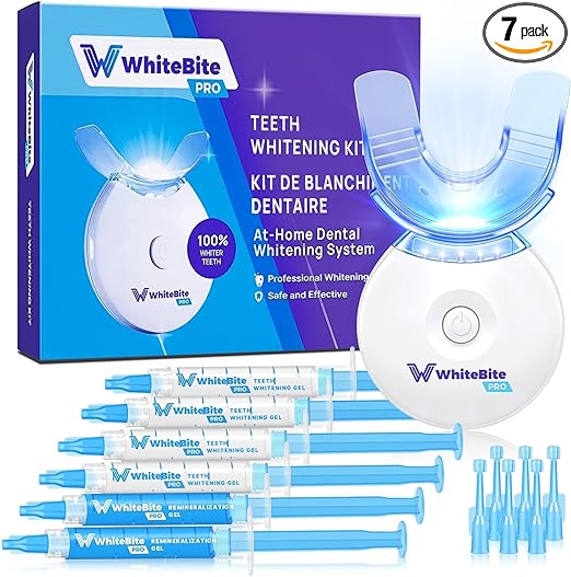 Dramatic Whitening Results: Achieve 8 shades whiter teeth in just one week. Noticeable results from the first use, bidding farewell to stains from coffee, soda, wine, smoking, and sugary foods. Dental-Grade Whitening: Experience professional-grade whitening at home. Our advanced formula combines 35% carbamide peroxide gel with an innovative LED light boasting 5 ultra-bright bulbs for accelerated results. Convenient and Effective: Enjoy the ease of our user-friendly kit. Custom-fit trays ensure precise gel application, complete coverage, and maximum effectiveness. The portable LED light with an automatic timer simplifies the path to a brighter smile. Professional Dental System: Before using the teeth whitening LED light, please remove the small paper tab inside the lithium battery. This is necessary for the light to function properly. Sensitive Teeth Solution: Designed for sensitive teeth, our gentle formula and included remineralizing gel strengthen enamel and reduce sensitivity, ensuring a comfortable whitening experience. Trust Whitebite Pro for safe and effective teeth whitening.