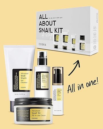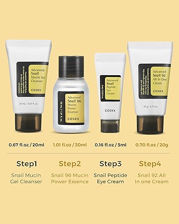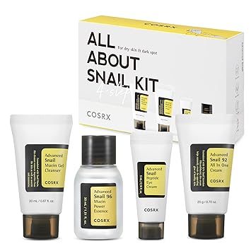 COSRX's Most Loved 4-step Advanced Snail Trial Kit: Skincare essentials formulated with snail mucin for repairing, moisturizing, and soothing skin. Advanced Snail Mucin Gel Cleanser (0.67 fl. oz) - With 10,000ppm snail secretion filtrate, it protects the skin barrier and does not strip the skin. Advanced Snail 96 Mucin Power Essence (1.01 fl. oz) - Lightweight yet intense moisturizing essence absorbs very fast into the skin and maximizes skin elasticity. Advanced Snail Peptide Eye Cream (0.16 fl. oz) - Contains 72% of snail secretion filtrate and peptides to reduce dark circles, fine lines and wrinkles. Advanced Snail 92 All In One Cream (0.70 oz) - With 92% of snail secretion filtrate helps repair and soothe sensitized skin after breakouts by replenishing moisture