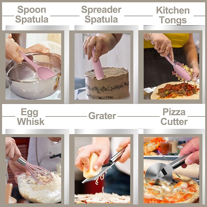 【FOOD GRADE SILICONE】Each kitchen utensil is made entirely of food-grade silicone and BPA-free. This silicone cooking utensils does not react with food or beverages. A set of excellent cooking utensils is related to the health of you and your family, therefore we choose more strict materials and quality inspection. Sweet tips: It is recommended to soak for half an hour before the first use and then expose to the air for about 3 hours, eliminate the original taste. 【STAINLESS STEEL CORE & NO GAPS, ONE PIECE DESIGN】 Each cooking utensil adopts the principle of an integrated stainless steel core to enhance durability and toughness, prevents the spatula from bending or deforming. The stainless steel is wrapped in silicone to form a whole seamless silicone design, you don't need to worry about any possibility of breaking and residual water stains. 【HIGHLY HEAT RESISTANT & NON-STICK COOKWARE】The silicone spatulas can withstand temperatures up to 446 ° F and has high-temperature oxidation resistance(even when used in high-temperature frying environments), you don't have to worry about is melting. The features of nonstick cookware and soft silicone head can protect your pot from any scratch, it is a good partner for a nonstick cookware. 【EASY TO CLEAN & DISHWASHER SAFE】It has a seamless silicone design which is an advantage as there aren't any cracks or ridges to catch food or harbor anything that makes it super easy to clean and use. Just put it in the dishwasher after use, and you will get a new set. This complete set of kitchen utensils is a highly creative gift that suits any kitchen needs and is a great helper for cooking, baking, and grilling! 【43 PCS KITCHEN UTENSILS SET & 43 INDEPENDENT FUNCTIONS】A set of 43 kitchen utensils can meet any cooking needs, we have carefully considered most of the scenes needed for kitchen use. Carefully selected such as: Slotted turner, Solid Spoon, Soup Ladle, Pasta Serve, Whisk, Brush, Kitchen Tong, Pizza Cutter, Grater, Measuring Spoons, Measuring Cups, etc. If you have any questions about this package, please feel free to contact our customer service and we are always at your service!