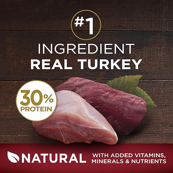 Real turkey is the number 1 ingredient in this Purina ONE venison and turkey dog food with 30 percent protein that helps support strong muscles, including a healthy heart Natural dog food with added vitamins, minerals and nutrients and with no artificial flavors or preservatives 100 percent Purina ONE dry dog food nutrition for adult dogs and 0 percent fillers means every ingredient has a purpose Premium dog food with omega-6 fatty acids, vitamins and minerals to help support his healthy skin and radiant coat and four antioxidant sources to provide immune support for dogs Complete and balanced dog kibble for adult dogs crafted by a veterinarian recommended brand in Purina-owned, U.S. facilities