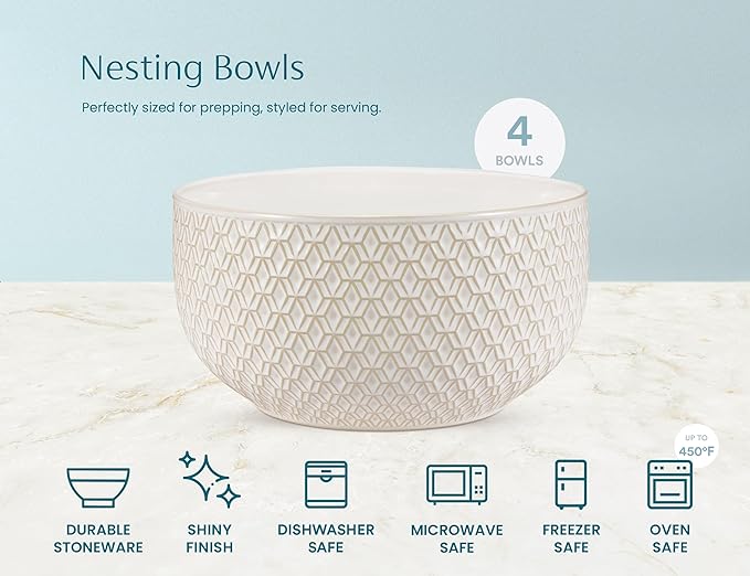 Nesting Bowls: Mix it up with this set of small, medium, large and extra large nesting bowls! Perfectly sized for prepping, styled for serving, and nests snugly for space-saving storing Salads, Snacks & Beyond: These versatile bowls are perfect for serving saucy pastas, big leafy salads, hot soups, buttery popcorn and everything in between Narbonne Collection: Made from durable and glossy cream stoneware. Each bowl is embossed with a geometric pattern and finished with dark copper accents. The set includes 20/44/98/145 oz bowls Easy Clean: These bowls are sturdy, odor & chip resistant. Use them to store leftovers in the freezer or reheat food in the microwave. Pop into the dishwasher for easy cleanup! The Kook Promise: We’ve carefully packaged each bowl with custom polyfoam molds to ensure it arrives in perfect condition