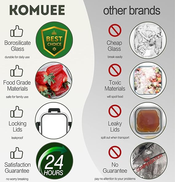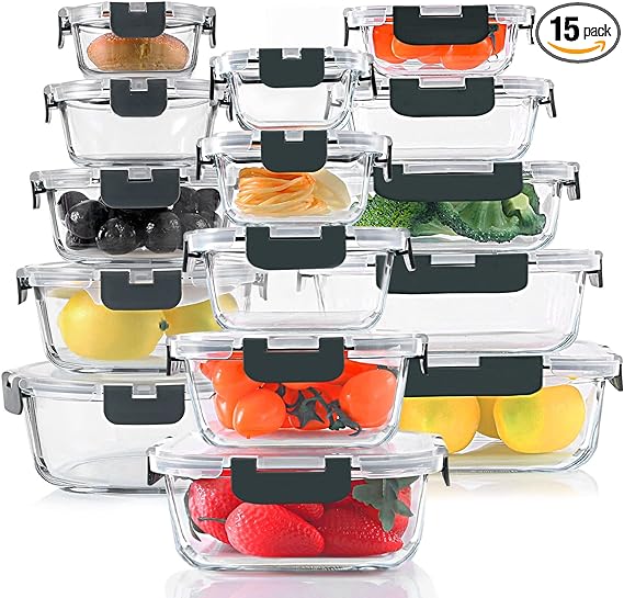 FOOD CONTAINER SET 30 PIECES: 15 Containers with 15 lids with multiple sizes and shapes to fulfill your storage requirement. Package includes: 1 (50.1 oz), 1 (33.8 oz) 1 (21.3oz ) 1 (13.5oz )1 (6.3 oz) 1 (37.2 oz) 1 (27.1 oz) 1 (16.9 oz) 1 (10.5 oz) 1 (5.4 oz) 1 (44 oz), 1 (31.5 oz) 1 (21.5oz ) 1 (12.5oz )1 (7.3 oz) container with lids. Easily stack-able for storage in refrigerator. HIGH QUALITY BOROSILICATE GLASS: Our glass storage containers are made of high quality borosilicate glass, which is stronger than cheaper glass food storage containers. Food can be directly stored to the containers after cooking. Great for gym, leftovers, picnic, portion control, office lunches, travel, and more, Stay healthy and save time by cooking and freezing your meals for later. FOOD GRADE & BPA FREE: Made of non-toxic and BPA free premium material.Easy to use and easy to take care of, as it’ can be used in the microwave, freezer, dishwasher, and oven. Take off the lids before placing in dishwasher, oven and microwave for better maintenance. Easy to clean without absorbing stains or smells, you can use them over and over again. AIRTIGHT SNAP LOCKING LIDS: KOMUEE Glass food storage containers use snap lock lids that comes with silicone seals to ensure your meal prep food will last much longer than normal plastic food storage containers, prevent the food from spilling. These lids are easy to open, shut and will stop leaking. These lids will not break or slowly stop working. CUSTOMER SERVICE: If you have any questions or issues regarding the KOMUEE glass containers set please do not hesitate to send the seller a message through Amazon we will respond within 24 hours.