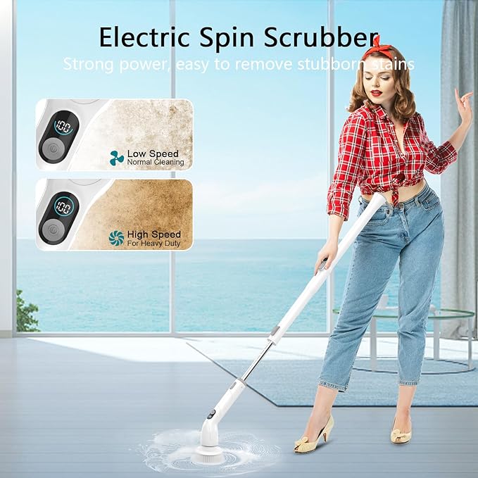 ✅【Save Time And Effort】 Upgraded Electric Spin Scrubber Cordless gets rid of the troubles caused by traditional cleaning tools. it can be used anywhere you want. This spin scrubber is super lightweight and very easy to pick up and use to clean surfaces without getting tired and drastically reduce your work time from 1 hour to 30 minutes. ✅【Powerful & Efficiency】The internal motor drives the rotating brush head to rotate at a high speed up to 450RPM±10%, can help you easily clean your entire house,especially when used with a cleaning agent, it can quickly clean stubborn stains and make entire house look new! Perfect for bathroom,bath tub,stone tile floor,grout,grooves,Toilet & etc. ✅【2 Adjustable Speed & IPX7 Waterproof 】You can easily clean your entire house in one fell swoop with this cleaning brush ,it set has 2 working speeds, I: Low Speed: 350RPM/Min; II:High Speed: 450RPM/Min; What you need to do is press the ON/OFF button once. The entire machine is IPX7 waterproof,you can wash the electric scrubber directly into the faucet without worrying about product damage. ✅ 【4 Replaceable Brush Heads】TUYU electric spin scrubber has equipped with 4 cleaning heads, a hard flat brush for large surfaces, a corner brush for curved areas, a small flat brush for detail work, and a pointed brush for gaps. All the brushes have long bristles that resist shedding and won’t scratch surfaces. which can be suitable for bathroom, kitchen, table, bathtub, floor,windows and Car various scenarios to meet most of your requirements. ✅【Adjustable extension Rod】The electric shower scrubber equipped with extendable stainless-steel handle . The handle can freely extends from 26 inches to 45 inches easy to clean hard-to-reach places, without kneeling or bending over. Say Goodbye to Traditional Cleaning Tools.A new type of household cleaning tools that can change your life! ✅【LED Display & Fast Charging 】Equipped with an LED digital display of battery usage,you will never need to worry about running out of power. The electric spin scrubber used fast charging technology, equipped with Type C charging port ,you can recharge it easier.Indicator light will be red when it's charging and get green when it's full. ????【Perfect Gift For Family And Friends】Portable cordless hand-held shower scrubber is ergonomically designed, you can use the electric cleaning brush to do housework in the most relaxed posture, no need to bend down and kneel to clean, take care of your waist and joints, save time and effort. it is an ideal gift for family, parents and friends, make housework a fun.