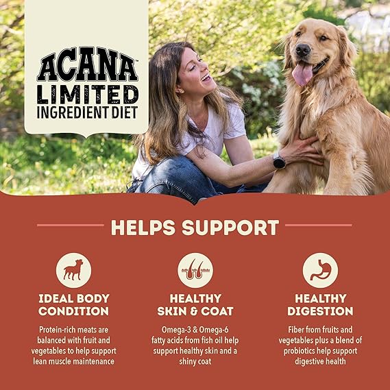 One (1) 4.5 lb bag of ACANA Singles Limited Ingredient Beef and Pumpkin Dry Dog Food High protein dog food recipe features 65 percent** high-quality beef ingredients and 35 percent*** wholesome fruit, vegetables and nutrients, and features a freeze dried dog food coating A fiber-rich blend of vegetables, featuring sweet potato and pumpkin, in this grain free* dog food provides digestive support Antioxidant-rich ingredients plus added Vitamin E help provide immune support while Omega-3 & Omega-6 fatty acids work to give your dog healthy skin and shiny coat Grain free* dry dog food made in the USA with quality ingredients from around the world