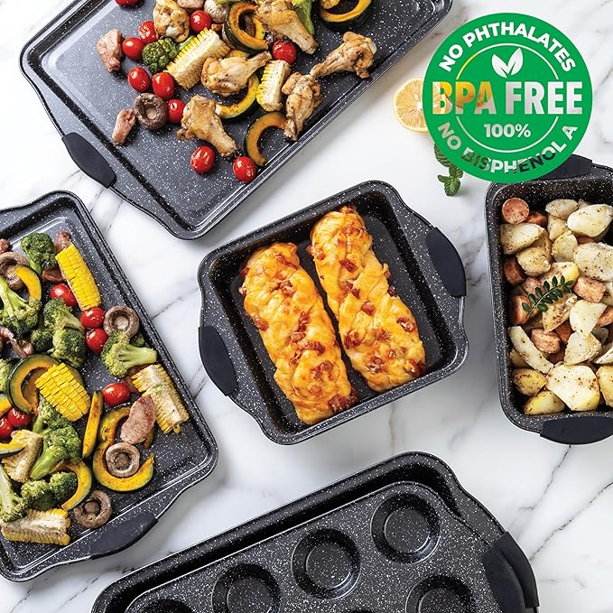 Stackable Bakeware Set: This cake pan set is a stackable bakeware set designed for space efficiency. It's great for small kitchens, saving you precious cabinet space while keeping your baking tools organized. Non Stick Pan Set: The large baking pan and small baking pans are all non-stick. You'll never have to worry about your cakes, cookies, or muffins sticking to the pan again. It makes baking and cleaning up a breeze! Silicone Handles: Our bakeware sets non toxic are designed with safety in mind. The silicone handles ensure a secure grip, allowing you to easily and safely move your nonstick baking sheets in and out of the oven. 10 Piece Baking Set: This space saving beginner baking set includes a variety of pans, great for all your baking needs. It includes a non stick cookie sheet, a large and small baking pan, and more. Nesting Bakeware Set: This nesting bakeware set includes nesting baking pans that fit neatly inside each other when not in use. It's great for those who love baking but have limited storage space!