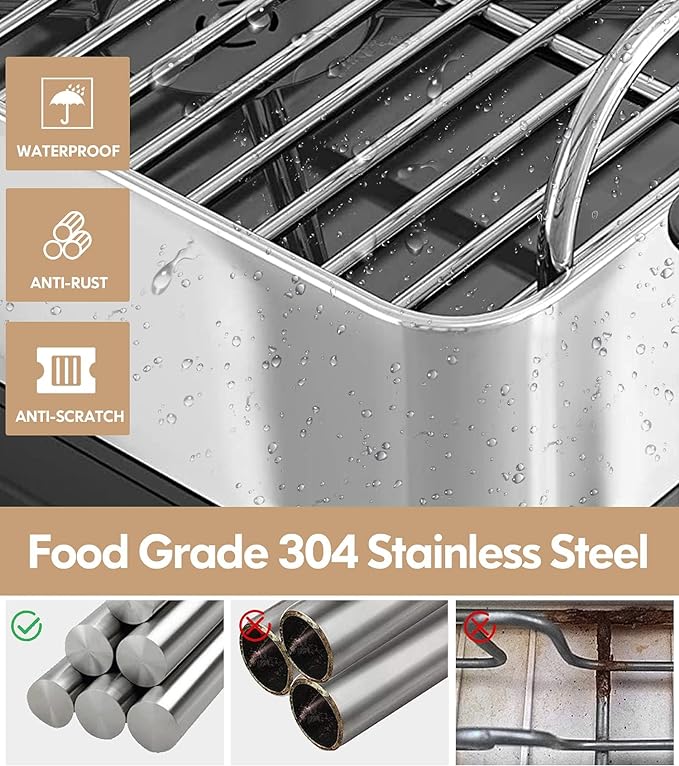 ✅Double-layer Large Capacity: The dish rack with a 2-tier design is suitable for large families. The upper one is for plates and small frying pans; the lower one can be used to put bowls, cups and full-sized pots and pans. The utensil holder has 3 separate compartments to fit knives, forks and spoons. The wine glass rack is another surprising delight. So altogether it makes perfect for kitchen to dry the daily used stuff. ✅360°Rotating Telescopic Swivel Spout: Clever design- practical drainer can catch any water and drain it automatically. No need to pour the water out manually! The integrated drain board is high capacity and has a drain spout that rotates 360° so you can put the rack next to the sink in the best position for your needs, and have it work. ✅Sturdy & Stable: One of the effective features of our durable dish drying rack is solid and heavy-duty for long-term use. It can hold up to 110lbs thanks to the strong material. This Dish Rack and Drainboard Set is very stable! There isn't even the slightest bit of wobble when you put many big plates and soup pots on it. ✅100% Rust-Proof & Anti-scratch: Made of food-grade 304 solid stainless steel, after the polishing and welding process, it becomes more durable than other dish strainers. The dish drainer is anti-rust, oil-proof, fingerprint-proof, and oxidation-proof. The whole rack is so smooth that you don't have to worry about hurting your hands. ✅Assemble Easily & additional 4 heightening pads: Very sturdy rack. Very easy to assemble. Size is perfect, 16.54(L)*12.6(W)*16.6(H) inch, will accommodate a lot of tableware on two tiers to keep dishes organized and really helped decrease counter clutter in your kitchen. If you think the bottom feet are a bit short, you can determine if you want to install the additional 4 heightening pads.