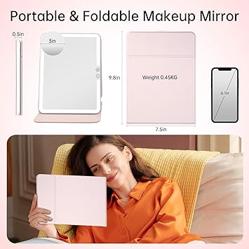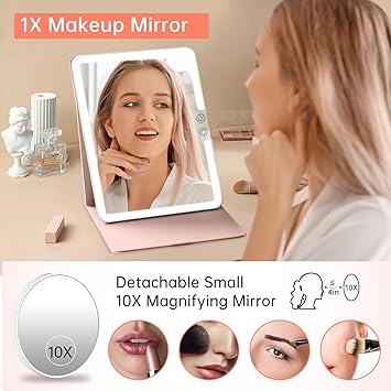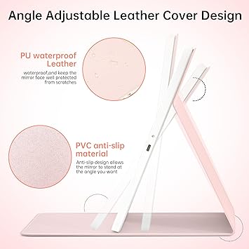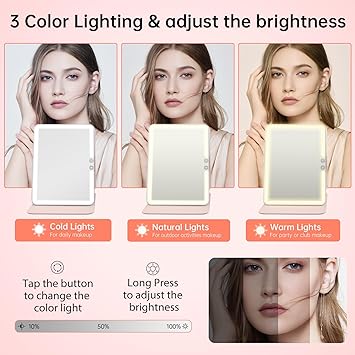 【2500mAh Type C Rechargeable Makeup Mirror】The large led travel light up mirror has a built-in 2500mAh rechargeable lithium battery, which can work continuously for up to 4 hours. It can be charged by connecting a charger or PC through the included Type C charging cable 【Lighted Makeup Mirror with Adjustable Stand Durable Leather Cover】:We specially designed a high quality protective cover for this lighted makeup mirror. With smooth PU leather and exquisite pattern,it not only looks elegant in appearance, but also can well protect the mirror from unexpected scratches.It support both stand stable in desk or folding when you want to take it everywhere 【1X Makeup Mirror & Detachable 10X Magnifying Mirror】1X Travel light up mirror with lighting is suitable for overall makeup and daily skin care. You can easily watch the full face effect. The 10X magnified mirror is the small detachable mirror. It can perfectly help you to precisely make up such as eyebrow trimming etc. 【3 Color Lights & Smart Touch Dimmable Brightness】This Lighted Travel Mirror has 98 built-in LED lights with 3 color lighting modes. Tap the color button to switch between cool, natural, warm light color temperature. The makeup mirror are naturally soft, bright and not dazzling, long press the switch to adjust the brightnes. 【Portable Lighted Travel Makeup Mirror】This travel lighted makeup mirror measures: 9.8 x 7.5 inches and is 0.5 inches thick when folded. The ultra-thin, lightweight and compact design will make you fall in love with it while traveling