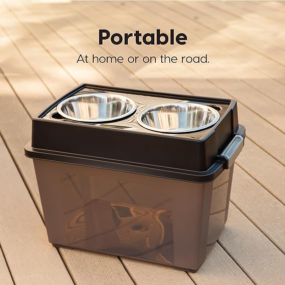 SUPPORTS PET HEALTH - This elevated feeder accommodates small-sized dogs and helps your dog improve digestion and reduce muscle strain by placing the food bowls at their level CONVENIENT - Includes 2 removable stainless steel bowls for easy cleaning, each bowl holds 2 quart of water or food AIRTIGHT STORAGE - Keeps dry pet food fresh and keeps pests out while the buckle design reinforces the lid for spill-proof usage AT-HOME OR ON THE ROAD - Excellent solution to keep your four-legged friend happy around mealtimes indoors, outdoors, while camping, traveling, or wherever they occur GREAT SIZE - 21. 53"L x 14. 29"W x 15. 04"H
