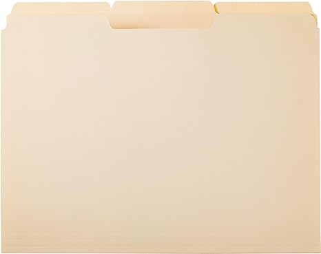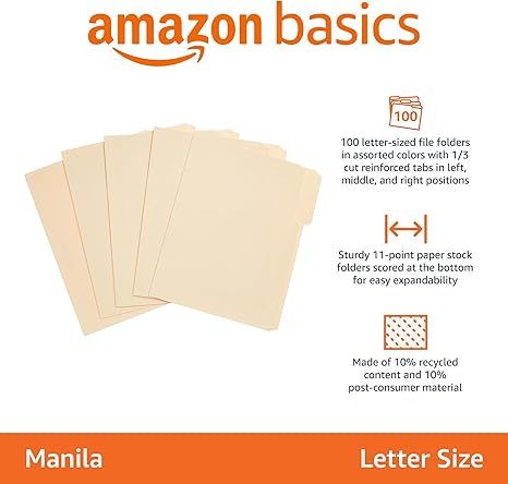 100 manila letter-size file folders; ideal for 8-1/2 x 11-inch documents 1/3 cut reinforced tabs in assorted positions (left, middle, right) for easy labeling and readability 11-point stock expands up to 3/4 inch while remaining sturdy Made of 10% recycled content; 10% post-consumer material Product Dimensions: 11.6 x 9.5 inches (LxH, overall), 3.8 x 0.5 inches (LxH, tab)