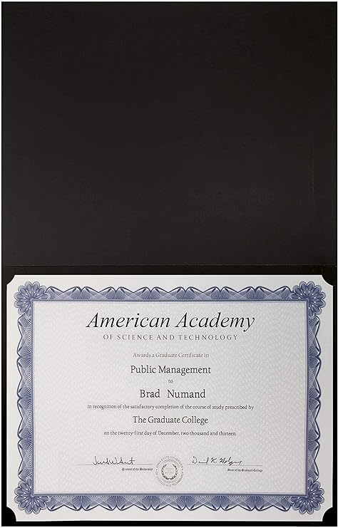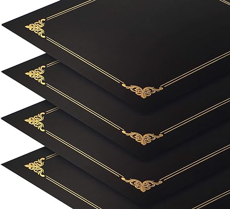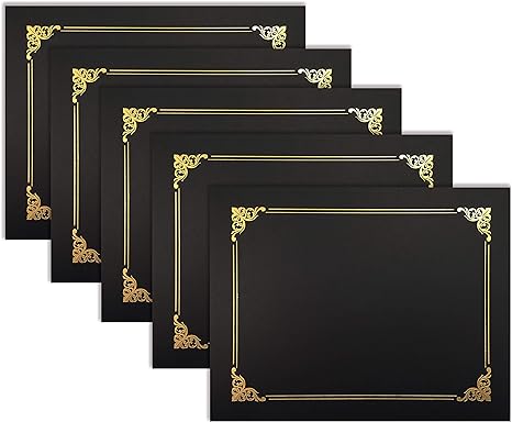 BULK QUANTITY: 25 black folding certificate holders HIGH-QUALITY: Each identical certificate holder is made of heavyweight, 300 gsm linen paper with an ornate gold foil scroll design on its cover. CONVENIENT and PRACTICAL: A suitably classy way to present and protect meaningful awards, diplomas and the like. INTRICATELY DESIGNED: Each holder is solidly constructed of one piece of heavyweight specialty paper, creased and folded, with reinforced edges on all interior sides and die-cut corner slots to secure letter-sized documents. VERSATILE: Can be used to hold and protect horizontally or vertically oriented award certificates, diplomas, momentous documents and/or photos.