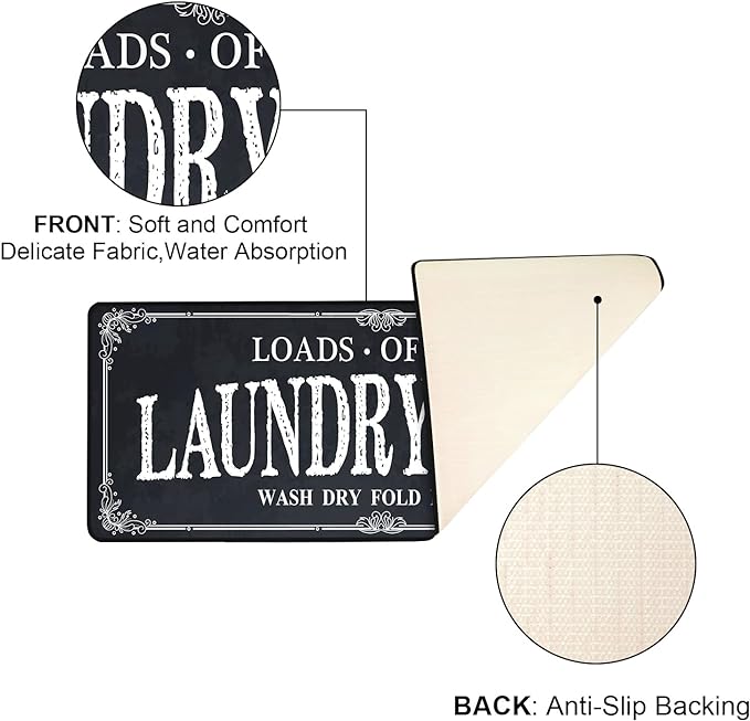 【Laundry Room Decor】Our laundry room rugs are designed by a professional stylist, whose patterns and words are unique and stylish. These laundry mats will light up your laundry room with vibrant color and funny sayings. 【Anti-skid Backing】Unlike those laundry mats with plastic dots backing, we use quality PVC backing, which provides great friction no matter the floor is wet or dry, wood or marble. You don't need to worry about the slide issue when standing on it. 【Anti-Fatigue Runner Rug】The size of this laundry runner is 20 X 47 inch(50 x 120 cm). The crystal velvet surface makes this rugs feel very cozy when you stand on it, the high density memory sponge interior provides support for your feet and knees over long periods of standing. 【Versatile Mat】Mixed with farmhouse and modern style,this laundry runner rug is an ideal laundry room decor. Besides, you can also used it as a bathroom mat for home and hotel, runner rug for bedroom and hallway, welcome mat for front door, etc. 【Easy Care】This runner rug for laundry room supports machine washing. For the convenience of transportation, the mats will be folded to ship. You may have rugs with creases when received. You can smooth it by ironing or just flat it out, the creases will disappear in 24 hours.