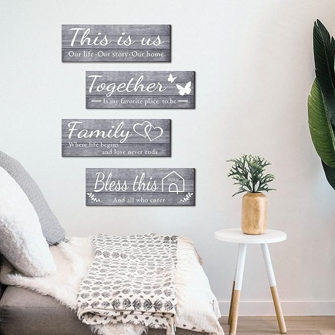 Beautiful decorations: Each package contains 4 home decorative signs. Size is about 4.7x13.8 inches (35x12 cm). You can hang them anywhere to make your home beautiful. Warm quotes: This is US - our life, our story, our home. Together - is my favorite place to be. Family - where life begins and love never ends. Bless this home and all who enter. These heartwarming quotes on the farmhouse entryway signs are a constant reminder to show love, respect and care at home to make you and your family feel happier. Easy to use: The wooden signs have a clasp on each side, so you can hang them directly on the wall nails. Or tie a string to both clasps first, then hang the string anywhere you want. Sturdy material: This set of decorative rustic signs is made of wood material, which is strong and durable, not easy to break, and can be reused for a long time. Widely used: This decorative set is suitable for many places, such as living room, bedroom, hallway, kitchen, farmhouse, entrance, wall, apartment, office, classroom, kindergarten, etc. It creates a family atmosphere and brings you a warm feeling. Good gift choice: This hanging sign is an ideal gift that you can give to your friends, classmates, family, colleagues, etc. for anniversaries, weddings, New Year's parties and new family housewarming celebrations to show a rustic charm to others.
