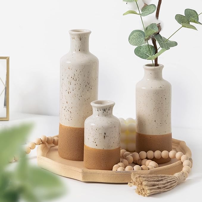 Package Includes: This ceramic vase kit contains three lovely distressed vases in white & brown duotone. The dimensions of the vases are 2.91”W*9.84”H, 2.64”W*7.48”H and 2.68”W*5”H. The vases are packed in a sturdy box with mould styrofoam, no need to worry about the damage during transit. Premium Quality: The vases kit is made of 100% high-quality ceramic. They are looking fresh and long-lasting. Once purchasing, they could decorate your home for decades. Elegant Look: The distressing techniques are adopted to make these three vases so stunning. There is crackled rustic design on the surface of the vases They fit various types of styles, such as modern farmhouse, rustic, classic charm, country, and elegant yet simplistic. The sizes and shapes of these three vases are specially designed, they are in perfect harmony while using together. Decorative Ceramic Vase Set: The vases are perfect decorations for home, they could effortlessly bring beauty to your dining room, bathroom, table, shelf, and mantel. They could also be stunning centerpieces for weddings, bridals, and baby showers. Great Centerpiece Option: With the elegant and aesthetic look, the vases could be used alone as decoration. Besides, adding faux or real florals, stems, bouquets and greenery into the vase, could show another kind of beauty.