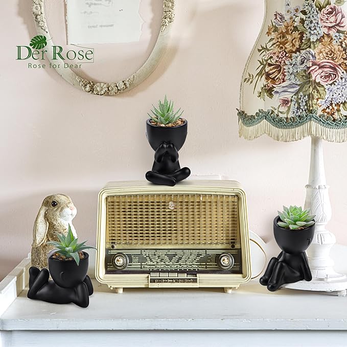 【Unique Design】These small fake plants include 3 black Human-Shaped Pots, and the desk plants' surface covered with flocking coating material to make it more lifelike 【Material Size】 Our artificial succulents plants are made of high quality plastic material, durable and tasteless.The max height is 5.9 inches and the max width is 4.73 inches 【Easy to maintain】This faux plants indoor is suitable for those who are busy but love plants because they can create a warm and relaxed atmosphere without requiring a lot of time to maintain 【Versatile Style】These cute faux succulents in pots are fit for different styles. Can be placed in home, office, bedroom, bathroom or shelf decor.Bring you the aesthetic enjoyment of life 【Funny gifts】Our succulents plants artificial can make the office desk decor accessories for women desk cute, not only add green, but also relieve stress and bring you a happy mood