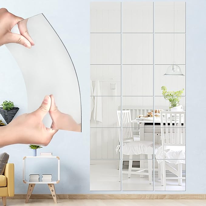【Acrylic Material】The self adhesive squares mirror tiles is made of acrylic material that has a smooth surface and a good texture,Which is safer and can avoid scratches,its shatterproof and bendable;Each adhesive mirror sticker is attached with a protective film on the front side,tearing off the film can show the reflection of the mirror. 【2MM Thickness】The thickness of our body mirror is 2MM. Compared to normal mirrors with a thickness of 1mm, our mirror looks clearer, more structured and more realistic.Wall mirror edges is delicate frosted,Our mirror safe for child and pets. 【Reflective Effect】Our acrylic mirror tiles with reflective effect can be applied for nice decorations; Reflective surfaces can make the space look larger and brighter;Please use mirror paste on a smooth surface, the flatter the wall, the better the reflection. 【Wide Application】The wall mirror decor can be used as an interior decoration, making the interior space more spacious, suitable for bedrooms, living rooms, bathrooms, dressing rooms, closet,kitchens,wardrobe,hallway, etc.You can use decorative mirror for workout mirror,gym mirrors,make up mirror,over the door mirrors long wall mounted. 【What You Will Get】18 piece stick on mirror, 8inch x 8inch / 20x20cm (thickness: approx. 2mm), as well as a double sided foam tape. Easily installed on smooth walls.You can use your imagination to arranging mirror sheets into any shape to decorate the home walls.