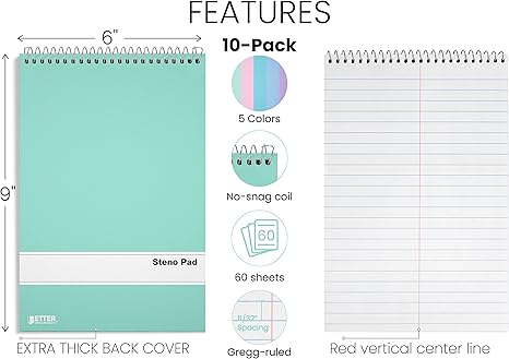 10 PACK ~ Front covers in 5 pastel colors (pink, teal, purple, blue, and green), 2 pieces of each. STENO PADS are convenient for school, home, or office use. 5 COMPLEMENTING PASTEL COLORS ~ Color code your project or subject matter so you can easily identify your steno pad by cover GREGG RULED ~ Standard stenography/note-taking rule; 11/32 inch spacing between lines with a single vertical line down each page; 60 sheets/120 pages TOP SPIRAL BINDING ~ Pages lay flat for the most comfortable writing conditions for both right-handed and left-handed users; snag-free spiral binding won't catch on clothing or on other items in your briefcase or carry bag REINFORCED COVERS ~ Each pad has paperboard front and back covers