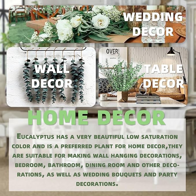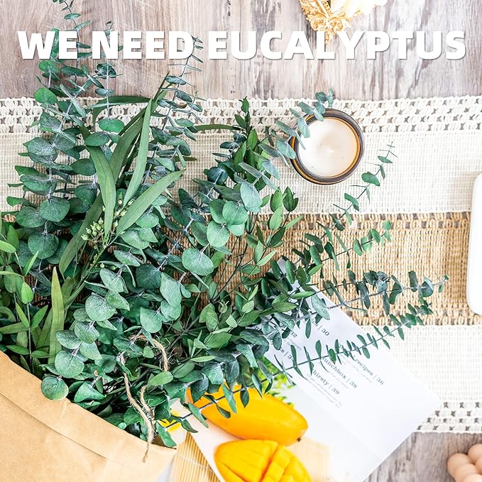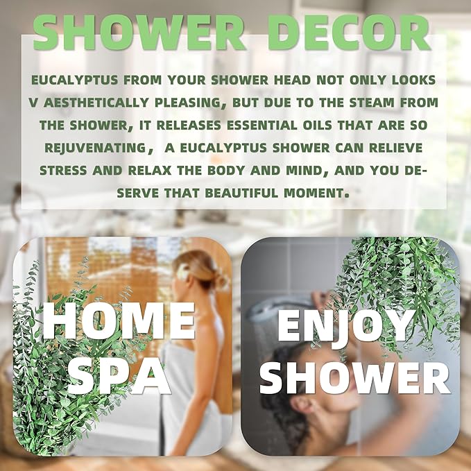 Enjoy shower - The easiest way to make your home feel like a spa! eucalyptus from your shower head not only looks v aesthetically pleasing, but due to the steam from the shower, it releases essential oils that are so rejuvenating,a eucalyptus shower can relieve stress and relax the body and mind, and you deserve that beautiful moment. Eucalyptus Scent--Eucalyptus has a distinct menthol-like offers a fresh, elegant, and relaxing aroma of the natural , scent that is commonly used in aromatherapy to encourage relaxation, relieve anxiety, and clear the mind,allowing you take a deep breath of nature's healing scent. Eucalyptus Leaves are made from fresh Eucalyptus without any additives, retaining the original floral aroma of Eucalyptus leaves. Preserved eucalyptus leaves will scent much less than fresh eucalyptus leaves, so some people smell the aromas very strongly, while others experience just a faint scent or hardly any at all. Decor and diy - Eucalyptus has a very beautiful low saturation color and is a preferred plant for home decor,they are suitable for making wall hanging decorations, bedroom, bathroom, dining room and other decorations, as well as wedding bouquets and party decorations.eucalyptus makes beautiful arrangements that are majestic, whatever your project, eucalyptus will be a lovely complement. From natural - We hand-select each eucalyptus tree from our Eucalyptus planting center, which is of the right quality, so that you can get the best experience. Preserved eucalyptus leaves--This is a special treatment of Eucalyptus sticks, which is kept fresh and completely. Through our exquisite and careful processing technology, all eucalyptus can maintain the most original appearance and natural beauty. As a result,, Inevitably, there will be color variations, such as a mix of brown, and green. Note: The white powders on dried eucalyptus leaves are not dust, It's real eaculaptus stems.