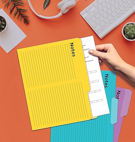 24 PACK - Eight vibrant colors of file folders with printed NOTES and lines (10/32" apart) on their front covers COLOR CODED - Features a LEFT/CENTER/RIGHT set of file folders for each of the 8 colors 1/3-CUT TABS - Sizable Left/Center/Right tabs to customize with pen, pencil or marker DURABLE - Made of heavyweight paper VERSATILE - For personal or professional use in the home or at the office