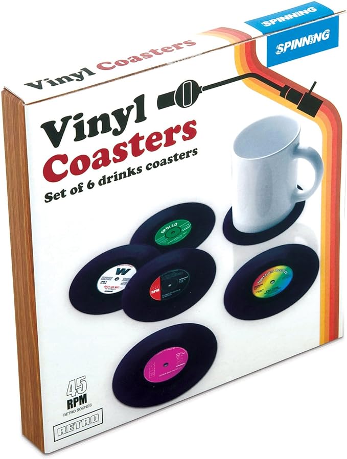 Adorn your coffee table with these stylish retro vinyl record coasters Each one features a different record label design Perfect for old school music lovers Comes in a pack of six Comes delivered in a retro music inspired cardboard box