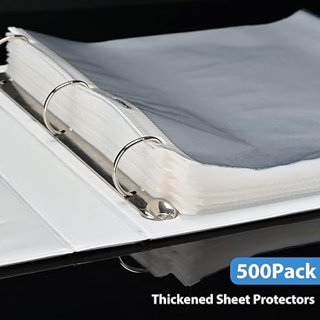 ✅500 PACK SHEET PROTECTORS-sheet protectors are perfect for standard letter sized paper, ourpage protectors 9.25" x 11.25" , fit 8.5 x 11 paper can hold up to 5-7 sheets depending on thickness,0.045MM heavyweight sheet protectors,The page protector will ensure the safety of all your important files for a long time ✅CRYSTAL CLEAR VISIBILITY-Crystal clear finish provides reduced glare ✅CONVENIENT&FAST-The upper opening design is easy to take out and put into the transparent inner page bag. lt can store some paper that needs regular use. ✅ARCHIVAL SAFE-High quality thick PP material,The page protectorfilm does not contain PVC, is acid-free,tasteless,Prevent static electricity,suitable for long-term protection of documents.Waterproof, moisture-proof and dirt-proof, protect your important documents from damage ✅120 day warranty Multiple Uses-These plastic plate protectors are very suitable for storing financial documents, insurance policies, study materials, certificates, recipes, and important documents. The paper protectors can protect them from wear and tear. They are often used in public offices and daily