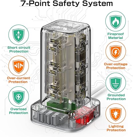 【16 IN 1 Tower Power Strip with USB-C】- This surge protector power strip with 12 AC outlets and 4 smart USB (1 USB C) charging ports(Total 5V/3.4A) can power up to 16 electronic devices simultaneously. Integrated circuit breaker and 1200 Joules protection rating ensure the safety of your electronics. 【Surge Protection & Overload Protection】- The surge protector tower with overload protection protects against spikes and fluctuations. The reset/off switch with integrated circuit breaker for overload protection of all outlets. This power strip has overload protection, short-circuit protection, over current protection, over-voltage protection and overheating protection. It will automatically cut power to protect connected devices when voltage surge is overwhelming. 【USB- C Fast & Smart Charge】- 4 USB ports total 3.4A, each USB A port features 2.4A Max output. USB C charging port features 3A Max. Built-in with smart technology, detecting charging devices and deliver optimal charging speed automatically, compatible with most USB devices. 【Flat Plug Extension Cord with Multiple Outlets 】- The Low-profile flat plug fits easily in tight spaces, 45° right angle plug design prevents other plugs blocking. The 6.5FT upgraded extension cord is made of pure copper, which is very thick and has better current carrying capacity . Environmental protection and fire-resistance PC shell with flame retardant at 1382℉ makes it more safe and longer lifetime. 【Wide Space & Space Saving】- With the vertical tower design, this surge protector takes a little space while powering even though 16 devices at same time. The steady base with anti-slip mat on the bottom effectively avoid wobbling and slipping around. 12 AC outlets with long space in between, it easier to use for all kinds of equipment and without blocking each other.