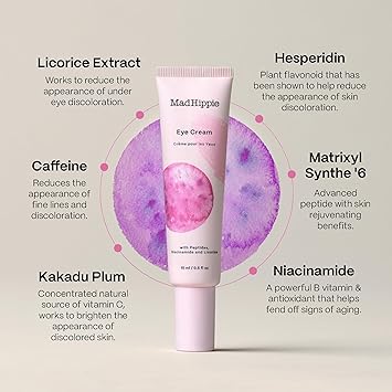 UNDER EYE CREAM: Three advanced peptides, anti-aging niacinamide, hydrating ceramide, and bioavailable vitamins help reduce wrinkles, discoloration, and puffiness. DARK CIRCLES UNDER EYE TREATMENT FOR WOMEN: Vitamin E oil combined with moisturizing shea butter, squalene (vegan), and argan oil help soften skin and fend off signs of aging around the eyes. CAFFEINE EYE CREAM: Our gentle eye cream contains caffeine to help stimulate and energize the skin around the eyes. FOR NIGHTLY USE: Thoroughly, gently, and carefully massage a small amount of the brightening eye cream into the skin around each eye before bedtime. MAD HIPPIE MAKES BEAUTIFUL & COMPLETE SKIN CARE: Non-GMO, cruelty-free, and vegan, our advanced skin care serums and creams transform your skin through the power of nature.