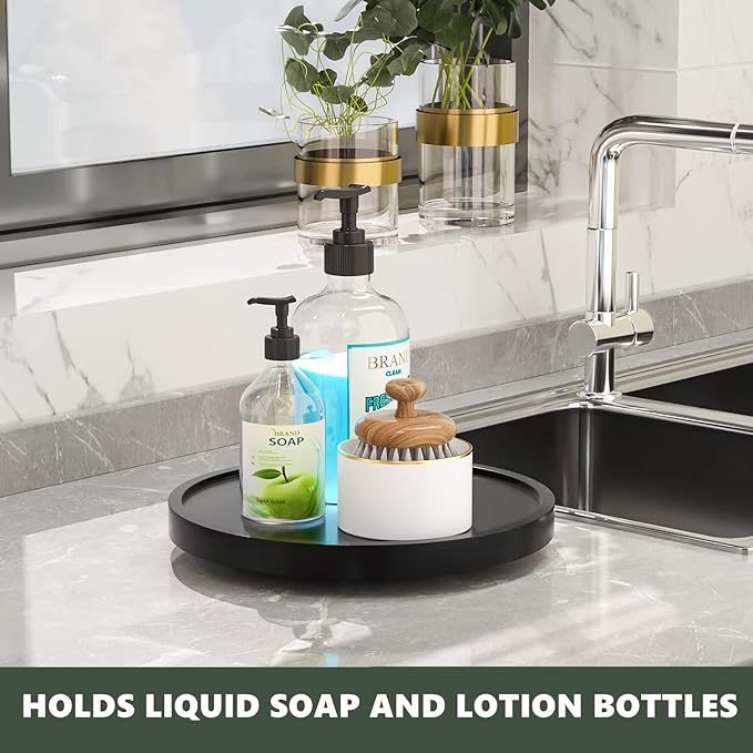 Multi-functions: Vanity tray to hold jewelry, perfume, cosmetics; bathroom tray holds liquid soap dispenser and lotion bottles, toothpaste cup; hold soap bottles and sponge by kitchen sink Worthiness:Delicately made more durable and more stable, charming color, smooth surface, easy to clean, can be placed on the bathroom countertop, kitchen countertop, dresser, and makes the house appear cleaner and more ordered Cooking assistant: lazy susan organizer perfect for organizing salt, vinegar, pepper, olive oil close to stove and easily reached; Center piece for table to hold napkin holder, honey, cinnamon, sugar and a vase; Helps keep table nice and organized Updated Design: Bigger acrylic turntable with 3 silica gel skid prevention pad makes lazy susan organizer rotate smoother and quieter. You can get any item from any angle. The additional lip prevents items from falling off High quality: Lazy susan turntable organizer made of renewable bamboo. Friendly to the environment. The proper size 10" x 10" makes the cabinet, closet, kitchen island, table neat and well-organized