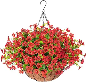 Artificial Fake Hanging Plants Flowers with Basket Outdoor Spring Decor Faux Red Silk Daisy Flower Arrangements for Planter, Porch Home Indoor Patio Garden Yard Decoration