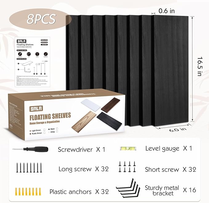 ????????????【Introducing SALA Custom Gift Boxes】 the impeccable choice for gifts that will bring delightful surprises to your family, friends, loved ones, and even your beloved kitten! 【DIY Your Own Display Corner】Great value for money! 8 combo set meets your decorating needs at once. Don't fret over cluttered desktops and cabinets! Why not utilize the walls instead? The wonderful combination of smooth metal brackets and solid wood texture makes your home look prettier and neater! 【Multi-Functional Floating shelves for wall】 Introduce versatile shelving wall mounted options to enhance storage and organization in the bedroom, bathroom, kitchen, coffee bar and other areas. In the kitchen, you can conveniently store cookbook, spice jars and utensils. The bathroom offers ample space for toiletries and towels. The living room becomes an exquisite display for small plants, trophies, collectibles, books, photos, and even serves as a cozy perch for cats. 【 Wall Mounted Design 】 Solid wood shelves with metal hanging shelf brackets are made of durable and sturdy paulownia wood. Our wood boards are carefully carbonized and fumigated, and then coated with varnish to prevent moisture. The treatment process is non-toxic and harmless, but allows the product to be acid-resistant, heat-resistant, and easy to clean. Decorative shelf for wall adds character to any modern, traditional, rustic, or farmhouse decor home and kitchen styles. 【Super Sturdy】 Each shelf: 16.5 X 6 X 0.6in. Package includes 8 paulownia boards, 16 metal brackets, 32 plastic anchors, 32 long screws, 32 short screws, 1 screwdriver, and 1 bubble level. We also provide you with a detailed install instructions for you to install the shelves in a few minutes.In addition, our wall shelves can hold up 40 lbs of weight when you install them firmly on the wall.