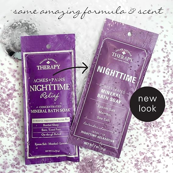 ON-THE-GO RELIEF: Relaxing your achy body and tired mind before bed can be a challenge – especially when you are constantly on the move. With our convenient, single-use Mineral Bath Soak packets, you can relax and unwind while on-the-go. Take a dip in the tub with a powerful blend of essential oils and extracts including Lavender, Chamomile, and cooling Menthol. POWERFUL INGREDIENTS: The Aches & Pains Nighttime Relief Soak is formulated with key ingredients that can help you unwind at the end of a long day. Let the calming qualities of Lavender, Chamomile, and Menthol relax your muscles and prepare you for a good night’s rest. The combination of Sea Salt and Epsom Salt helps to draw out impurities and ease aches and pains. EASY TO USE: Winding down before a restful night of sleep has never been easier. Simply sprinkle 1 packet (about two ounces) under warm running water for a soothing soak in the tub. Don’t have time for a full bath? Pour the contents of the packet into a tub with a shallow amount of warm water and restore your tired feet in a relaxing, rejuvenating footbath. MADE WITH CARE IN THE USA: All Village Naturals Therapy products are proudly made in the USA, and never tested on animals.