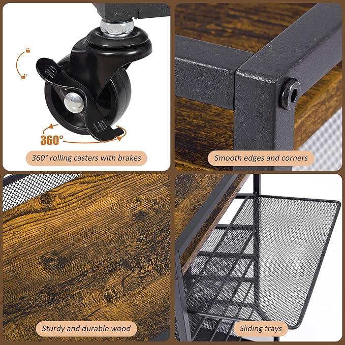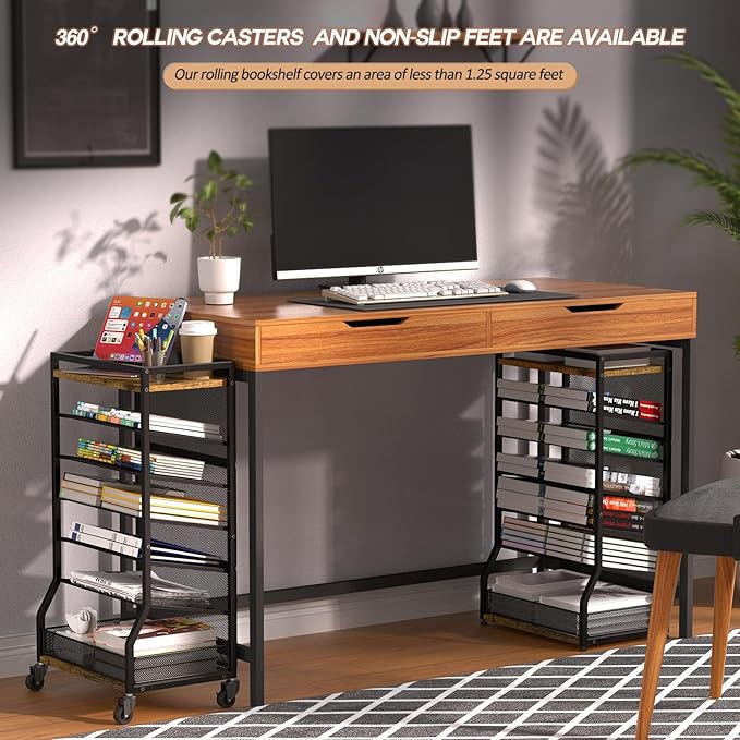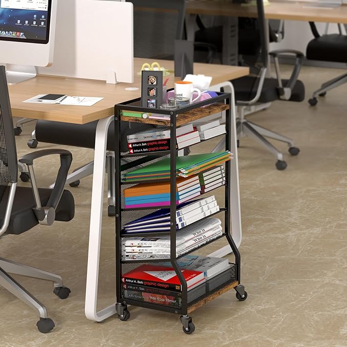 7 Tier Large Storage Capacity: This desk organizer features 7 tiers and offers ample space to accommodate a large number of desk supplies. Utilize the full storage capacity of this rolling cart to enhance the cleanliness and organization of your home. The dimensions of the desk file organizer are 16.1 inches * 11 inches * 29.9 inches, ensuring it occupies only a small footprint in your home. Sliding Tray Design: The middle tier of this rolling file cart features five mesh trays that can be effortlessly slid or pulled out. This innovative design provides enhanced accessibility to our belongings. The sliding or pull-out mechanism is incredibly convenient and guarantees smooth operation without any jamming issues. In fact, you can even remove a tray based on your specific requirements. Multi-purpose: This versatile storage cart is suitable for various settings such as office, study, living room, library, classroom, hospital, and more. The bottom and top layers are perfect for storing books, water cups, clocks, photo albums, stationery, potted plants, and a wide range of other items. Sturdy & Durable: The paper letter tary organizer is crafted with a combination of metal and wood materials. Apart from the top and bottom trays that are constructed with MDF wood, the remaining parts of the cart are made of metal material. This metal construction ensures a stable structure that is not easily shaken, and the surface is coated with a rust-resistant finish. The combination of MDF wood and metal not only provides durability but also gives the shelf a retro appearance. 360° Rolling Casters and Non-slip Feet are Available: When installing rotating wheels, the size of the file cart is 16.1 inches *11 inches*29.9 inches, maybe you can just put your desk organization stand next to the table. When installing the non-slip feet, this height is 27.9inches, maybe you can put this office organization under the desk if your desk is the right height.