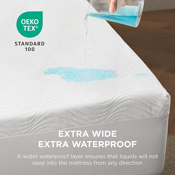 EXTRA-THICK WATERPROOF LAYER like never before: We've increased the thickness of the waterproof layer to prevent liquid leakage and overflow from damaging your mattress. Extra Wide, Extra Waterproof: This mattress protector has wider waterproof layer ensures that liquids will not seep into the mattress from any direction. Comprehensive Layered Design: Our mattress protector features a four-layer structure including a extra-thick waterproof layer. The innovative design offers superior protection against spills and accidents, ensuring your mattress stays dry and clean. Air Knit Structure With 45% Rayon Derived From Bamboo: Our waterproof mattress protector features an advanced air knit structure for enhanced breathability. Crafted with 45% rayon derived from bamboo fibers, this layer offers exceptional moisture-wicking and temperature regulation, ensuring a comfortable and sweat-free sleep all night long. Wash and Care Tips: Our mattress protector is easy to care for – simply machine wash and dry. For better drying results, position the top layer outward and ensure the waterproof layer faces inward. This makes it a practical choice for everyday use. Dreams Protected, Sleep Perfected.