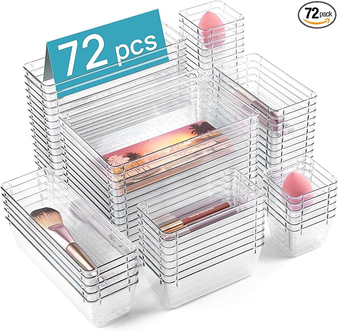 【Make Everything Organized】These clear versatile drawer dividers trays are perfect for any place in your home. Fit all kinds of drawers, such as vanity / bathroom / kitchen / office drawers/ craft room, ideal for organizing cosmetics, makeup tools, hair accessories, jewelry, pins, office supply, craft supplies, utensils, etc. 【Combination of 4 Different Sizes】One set includes 72pcs storage bins in 4 different sizes, which help you customize combinations to store items and organize drawer in shelf/ closet/ cabinet/ dresser . Includes: 9 x 6 x 2.2 inches (12pcs), 9 x 3x 2.2 inches(20pcs), 6 x 3 x 2.2 inches(18pcs), 3 x 3 x 2.2 inches(22cps). 【Non-Slip and Durable】Extra 350pcs silicone pads are included, just stick them on the bottom of the plastic trays for non-slip. Made of durable and clear plastic, so you can see what’s in it without digging around or making a mess, help you get a neat lifestyle. 【Stackable Storage】The drawer bins can be stacked into one other when you not use them, that will save much space and organize well. You will find it's so easy to keep things neat and tidy. 【Easy to Clean】Our desk drawer storage bins are easy to be wiped clean with a damp cloth and perfect for keeping everything in its place. Convenient for use in your daily life, make everything look beautiful and better organized.