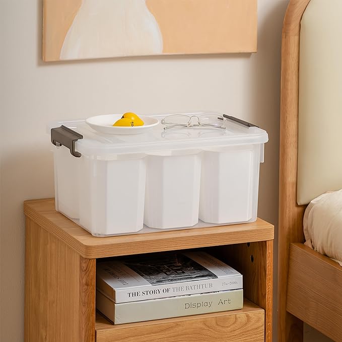 ????【Organization Made Easy】With the modular Citylife storage bins, taking a minimalist approach to storage can give you maximum flexibility. Perfect sort and storage screws, nuts, washers, craft, and crayons to help get your work area in order; ????【6 Detachable Tall Inserts】These inserts help separate a bin into multiple organized sections. This prevents the items from moving around and getting mixed up in a container. Can also be used in drawers and desktops; ????【High Transparency】This clear design keeps the look neat and clean and lets you quickly identify the contents stored inside; ????【Stackable & Nestable】The grooved design of the lid for extra stacking stability. When more space is needed. Remove all of the inserts so the plastic bins can nest inside one another; ????【Durable Construction】Including 2 storage bin and 6 inserts. This box measurement is 15.94"L x 11.61"W x 7.28"H/17 quarts. Single insert measurement: 5.12"L x 4.72"W x 5.71"H/1.7 QT. Made of premium durable and thicker PP5 plastic so you don't have to worry about chipping. This can make it last a lifetime. odor-free, and BPA-free.