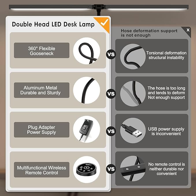 【Remote Control & Multifunction】This double head LED desk lamp is equipped with a wireless smart remote control, allowing you to choose the most suitable mode faster and more portable. It also owns two special functions (memory function and timing function ). The memory function can keep the desk lamp in the last used mode and brightness without resetting. The timer function can make the desk lamp turn off automatically after working for 1 hour, preventing us from overworking. 【Ultra Wide Ultra Bright & Easy to Install】The LED light is designed with dual lamp heads, the lamp bars can be extended up to 31.5 inches, and it can evenly cover a desk with a width of 71 inches and provide sufficient and comfortable lighting. The installation process is easy and simple, no additional tools are required. The adjustable metal clamp design can easily clip the desk lamp to the edge of the table top up to 2 inches, freeing up more table space. 【Multi-Mode & Gooseneck Design】5 color temperatures (3000K-5500K) × 5 levels of brightness (20%-100%), 25 light combination modes can be realized. It also has night light mode and reading mode to meet your various lighting needs. The desk lamp is designed with a 360° gooseneck and 180° foldable swing arms, and the lamp head can also be freely rotated 270° front and back, allowing you to turn the desk lamp to any angle to provide you with the most suitable lighting range. 【Eye Protection & Multiple Scenes】This LED desk lamp is evenly illuminated, with no glare, no flicker, and no blue light hazard. Soft and even lighting helps to relieve eye fatigue caused by long-time watching computer screens, thus protecting our eyes. This is very suitable for large workbenches with wide curved monitors or dual monitors, drafting desks, and architect desks, allowing you to have a good lighting environment when working, reading, studying, drawing sewing, and crafting. 【24/7 Quality Service】Our LED desk lamp has good heat dissipation, long service life, energy saving and power saving, no need to replace frequently. Our export products are 100% quality inspected, please rest assured of our product quality. We promise to provide a 365-day warranty for the product, if you encounter any problems during use, please feel free to contact us, we will provide you with the best solution in the shortest possible time.