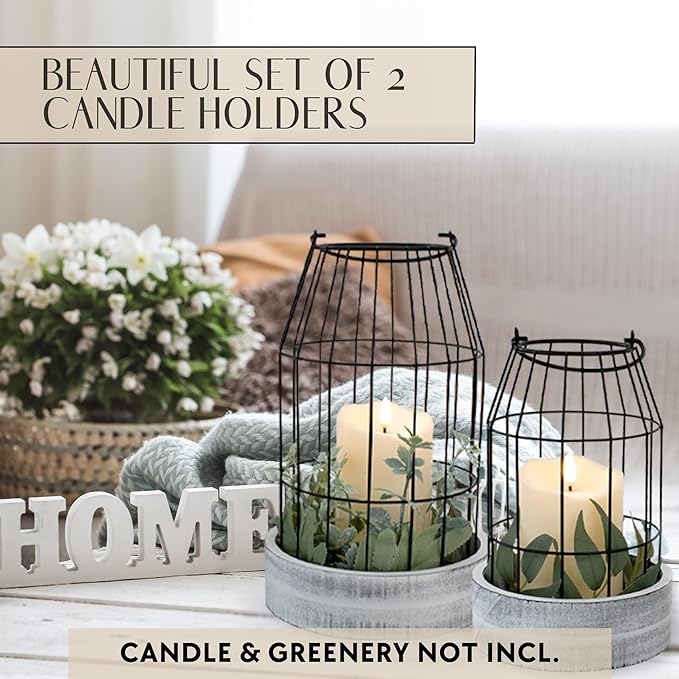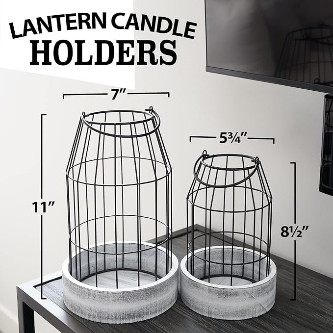 Beautiful Modern Farmhouse Decor: Enhance your home decor in a unique way with the cute lanterns by KIBAGA! The rustic finish with the classy metal wire and wooden stands in a stylish distressed white look make them the perfect addition to your farmhouse decor in your living room, hallway & co.! Set of 2 - Look Out For The Marvelous Duo: The two lanterns complement each other beautifully and form the most perfect rustic decor team! The set consists of two different sized lantern candle holders - a small one with 8.9x5.6” and a big one with 11.5x6.9” Simply Charming - Anywhere In Your Home: The farmhouse metal lantern set makes for a lovely decor highlight around the house - use it as centerpiece on your dining table, as fireplace mantle decor or even use it to upgrade the decoration at a party or wedding to the next level! Decorate Exactly To Your Taste: Do it your way - the lanterns offer you countless decor options! They look amazing with LED candles, faux ivy or other faux plants, fairy lights, flowers and other decor elements - you can even add seasonal accents for Christmas, Halloween & more (please note: not intended for real candles) A Wonderful Gift For A Loved One: We know - these lanterns are such a great & versatile decor you just wanna keep for yourself, but why not get another set and put a smile on someone else's face? The lanterns are a fantastic gift for a birthday, housewarming, mother’s day etc.