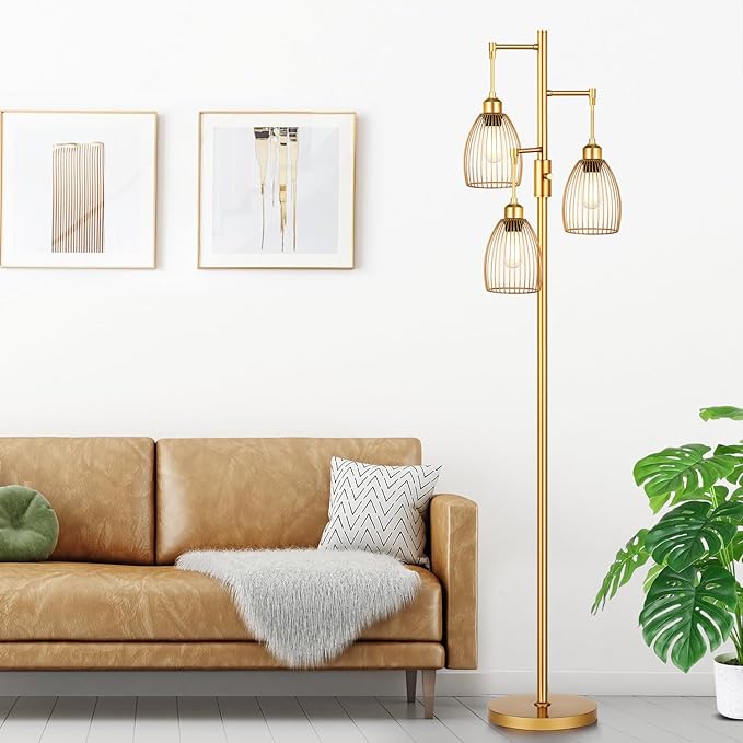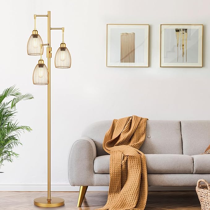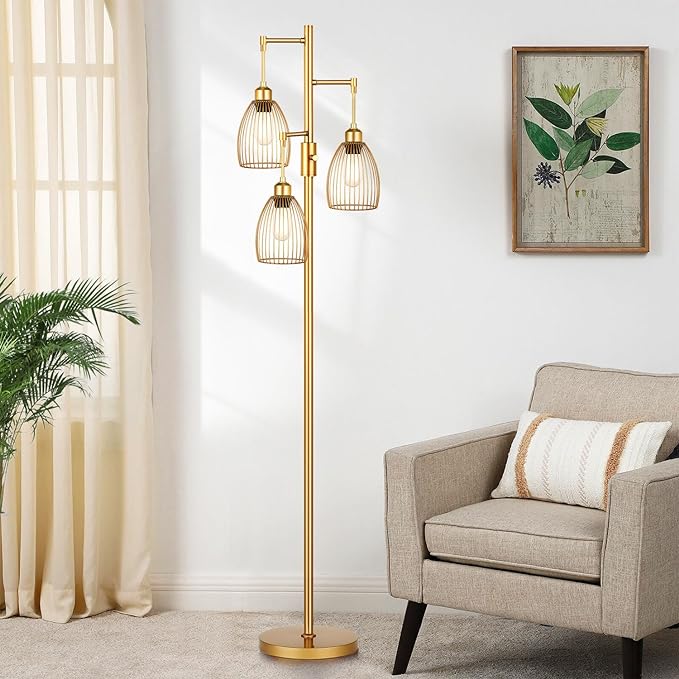 Dimmable Industrial Floor Lamps for Living Room, Gold Tree Standing Tall Lamps with 3 Elegant Teardrop Cage Head & 800 Lumens LED Bulbs for Bedroom Office