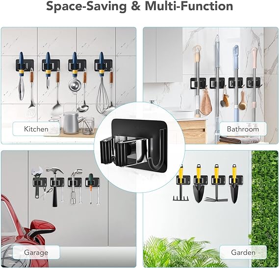 ✔ Get Your Home & Life in Order: HOMEASY mop broom holder includes 1 shelf and 1 hook, which can be used to organize broom closets, kitchens, garages and gardens, making it an ideal space-saving choice. Make everything at home more natural and comfortable. ✔ Waterproof: HOMEASY self-adhesive broom holder wall mount is made of high quality SUS 304 stainless steel, waterproof and rustproof. Triangle-buckle & petal-shaped gear adjust size automatically based on different thickness of the handles to prevent object slipping. Can stand up to 10 KG, more strong and sturdy than plastic holder. ✔ Easy to Install: HOMEASY wall mounted mop broom clip hangers is easy and convenient to install, just stick on the wall with strong self adhesive which firmly keeps your mop in place and guards them from falling off. ✔ Suitable for Indoor & Outdoor: HOMEASY mop broom organizer is perfect for the kitchen, closet, garage, office, great for commercial use. Since it is with weatherproof design, this broom mop hanger can even work outdoors or on the shed for your garden tools. ✔ Multi-purpose Storage: Self adhesive mop organizer is helpful to organize the mop, broom, umbrella, brush, shovel and other tools, keeping your home clean. The hooks can hang a variety of daily items, improving storage space.