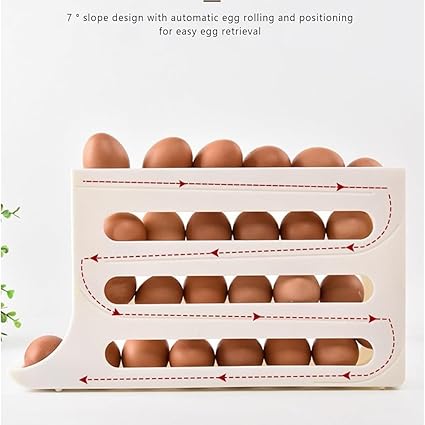 Our egg dispenser features a gravity structure and tilt design that helps roll eggs without getting stuck. It dispenses one egg at a time in a gentle rolling motion, and the rest of the eggs roll forward automatically, so you don't worry about eggs falling or tipping over. 4-tier rolling egg holder, holds approximately 30 eggs. You can easily add or remove eggs from the dispenser. The small footprint saves space on your refrigerator or kitchen counter and allows you to get out of cartons and stay neat and organized. Railing protection is added on both sides of the egg storage for refrigerator, and the groove of the egg slide rail is deepened to make eggs safer to place on it, and the eggs will not be broken due to unstable product structure. our refrigerator egg holder is made of high-quality materials, durable and not easily damaged, perfect for modern kitchen lifestyle, can be reused for a long time, store eggs neatly and create a strong fortress for your eggs. Try adjusting the position of the eggs as they may get stuck after rolling around in the tray. If the egg dispenser you receive is damaged or not working properly, please contact us as soon as possible and we will solve it for you within 24 hours. We are committed to providing you with perfect service.