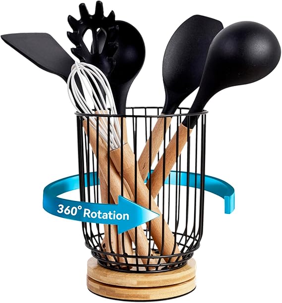 Utensil holder for Kitchen Counter,Large Utensils Holder For Farmhouse Cooking, Utensil Caddy Spatula Holder (Rotating+Metal+Bamboo-1)