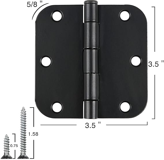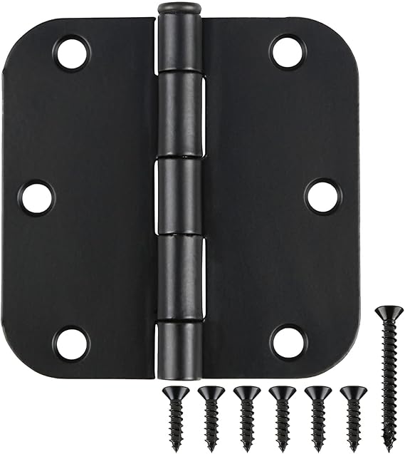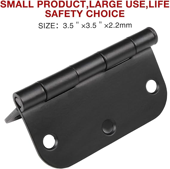 Door hinges Black Matte 3.5 inch with 5/8 rounded corners and 6 holes for front door,cabinet,wooden box. Safe black door hinges 3.5" Includes 144 free screws for quick and easy installation.Mat black door hinges can be rotated 270 degrees.The extra long screws will come in handy specially when replacing existing hardware using the same hole pattern. Security House door hinges 3.5 inch suitable for drawer,dresser,wardrobe. Shower,bathroom,bedroom,living room door hinges matte black 3.5. Smooth operating plain bearing hinge.Strong sturdy design make these interior door hinges a long lasting.These door hinges are made of high-quality iron, solid,thick. The Non-Removable Riveted Pin also provides additional security. Full Mortise black matte door hinges 3.5 inch security perfect for apartment, hotel, office, hospital, old school,dorm,dormitory,hostel,living quarters,company,kindergarten,nurser school,company,police office/station,shop,factory,class room,library,gym,gymnasium,fitness centre, palaestra,log cabin,blockhouse,frame house,restaurants,galley,kitchen,cook house,etc. The plain bearing hinges size is 3.5 inch x 3.5 inch Door Hinges, hinges for doors interior black.These hinges could be mounted on shed windows, shed hardware, shutters, skylights, vents, flower boxes, etc. for all kinds of outdoor buildings such as dog house,cowshed,byre,cattle/vegetables sheds,castle,playhouses,animal shelters and more. Please see the picture:how to remove a hinge pin? Beat the nail with a hammer as shown to remove the pin.You can use black matte door hinges with the black hardware door knobs match.door hinge 3.5 inch black match with fashionable furniture to create a modern sense.