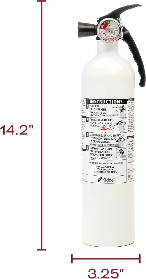 Specifically designed for grease fires, the flared nozzle reduces the splashing of oil Lightweight: Durable, corrosion-resistant aluminum cylinder Easy to read pressure gauge tells you when the fire extinguisher is charged & ready for use Tough, metal valve assembly, rust, and impact resistant handle, & easy to pull safety pin 2.5 pounds of sodium bicarbonate fire-fighting agent in the tank