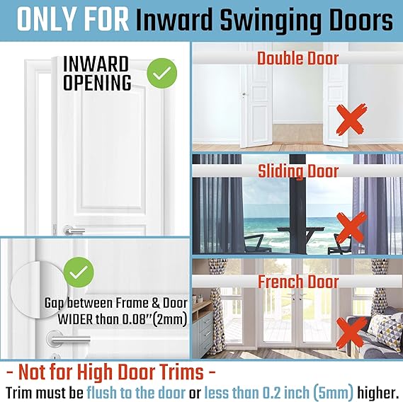 ✓ 【Keep Your Home Safe】The 3" door lock is designed to withstand maximum 800lbs of force for Inward Swinging Door. It helps prevent doors from being kicked in. Increasing your home security and keeping your family safe. ✓ 【Easy to Install】Come with strong screws. Simply mount the door lock on your door frame using a screwdriver or power tools. The installation takes less than 5mins. It may be necessary to trim down a portion of the door frame if it is too thick ( 0.2'' (5mm) higher than the door ), as the excess thickness can hinder the installation process. Please check the image to see if our product is suitable for your door. All long and short screws included in the package are now suitable for the locking holes on the mounting plate per many customers' requirements. ✓ 【Easy to Lock & Unlock】To unlock, pinch the door lock on the top and the bottom. Then slide the lock sideways along the door to the direction of the hinges until it can be pulled outward. ✓ 【Childproof】Security Door Lock adds extra security for children, prevent from opening door to strangers. Please install higher than the doorknob where your children can not reach. ✓ 【Great Design】Features a spring-loaded, childproof and tamper-resistant design. High-quality aluminium material provides higher safety than traditional door locks to protects against unauthorized entry.