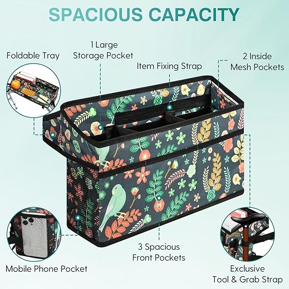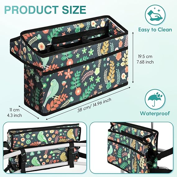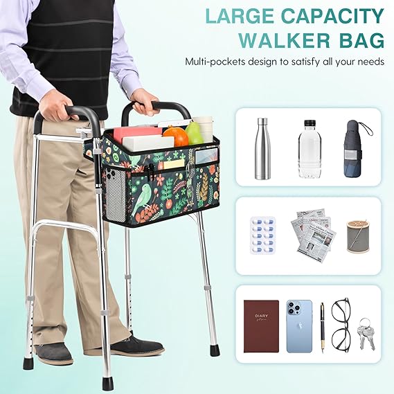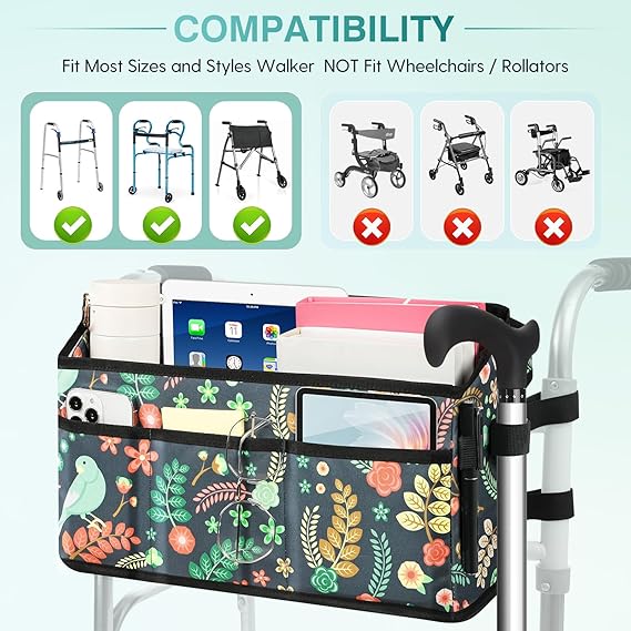 【Added Convenient Tray】The walker storage bag adds the convenient tray on the back to give you more storage space to keep your frequently used items closer at hand, such as your wallet, phone, small snack or umbrella, making shopping trips and daily tasks even easier. The trays for walkers can fold up compactly when not in use. 【Upgraded Stability】Our walker bags have been upgraded in stability to ensure safety. At the bottom, we add a supporting panel to enhance the balance of walker baskets, making the whole structure more stable. Equipped with nylon buckles, you can secure it firmly, so that the walker won't tip over with overweight items. 【Large Capacity】Multi-pocket design increases flexibility and organizes accessories well, allowing you to carry and store your belongings such as glasses, mobile phones, newspapers, medicine, etc. The side mesh pockets can be used to store water bottles, drinks, umbrella and other necessaries. And our walker basket also offers a handy convenience tray for lightweight items. 【Foldable Trait】The removable baffles allow the walker accessories for seniors to hold more weight when placed on either side of the walker bag without deforming. When not in use, remove the baffle and fold up the bag to save space. Lightweight and portable, it can be your great companion of the walker. 【Fit Universal Walkers】This accessories for walkers is an elegant choice for the elderly people with mobility problems. When they want to carry something on the go but can't always free their hands, this walker organizer is a practical solution for them at this time. Suitable for most sizes and styles walker, but NOT suitable for wheelchairs/rollators.