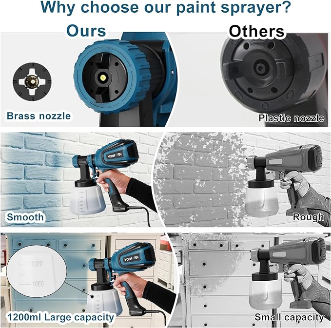 【4 Nozzles & 3 Spray Patterns】VONFORN 700W paint sprayer equipped with 4 size nozzles(1mm,1.5mm,2mm, 3.0mm) for most painting projects, such as furniture, pickup, walls, doors, garden tables and chairs etc. Can be adjusted to 3 different spray patterns: horizontal, vertical and circular, so that it can be applied to a wide range of application scenarios. 【Unique Blowing & Cleaning Functions】Before spraying, you can use the dust blowing joint with the paint sprayer to blow away the dust/debris on the surface to get a better surface spraying effect. After spraying, connect the cleaning connector to the faucet to clean the residual paint inside the pipe for easy cleaning. 【Easy to Use & Clean】The paint sprayer can be easily assembled with no tools, even if you are a beginner, you can easily get started after reading the manual. It is very important to clean the paint sprayer thoroughly after use, it comes with a cleaning brush and a needle to clean paint left in the nozzle part. 【Adjustable Flow Control】The amount of paint output can be controlled by adjusting the flow control knob to suit a wide variety of projects. According to different spraying effect requirements, reasonable control of paint flow can achieve better effect and avoid paint waste. 【What You Will Get】1X Paint Sprayer, 4X Size Nozzles, 5 X Paint Filters, 1X Viscosity Cup , 1X Nozzle Cleaning Needle, 1X Cleaning Brush, 1X Dust blowing joint, 1X Clean connector, 1X Pot lid,1X User Manual. If you have any questions, please contact us via your order, you will get a reply in 18 hours, our technical team and after-sales team are always behind you.