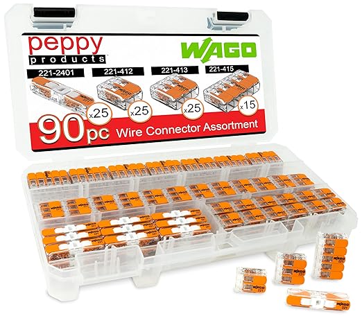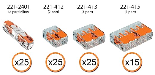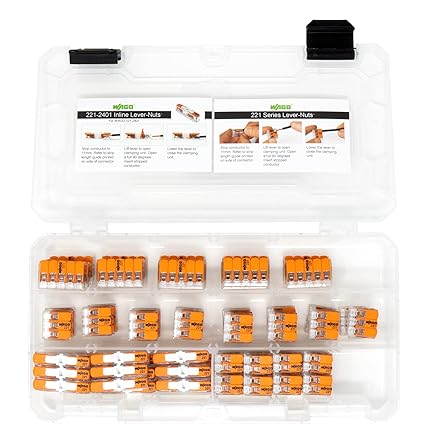 Connect any combination of solid, stranded, and flexible copper wires faster and more reliably Terminates 24-12 AWG for 221-41x, 20-12 AWG for 221-2401 UL Listed, Genuine WAGO LEVER NUTS Visually inspect for proper strip length and complete wire insertion through its transparent housing Includes: 25x 221-2401 (2 conductor inline), 25x 221-412 (2 conductor), 25x 221-413 (3 conductor), 15x 221-415 (5 conductor) with case