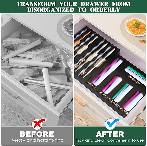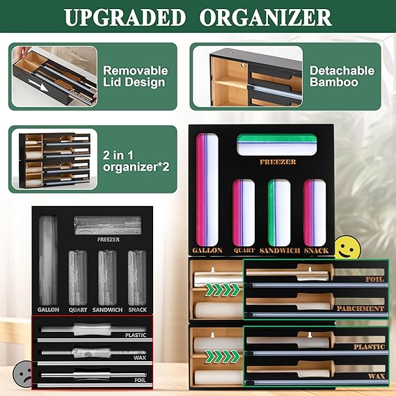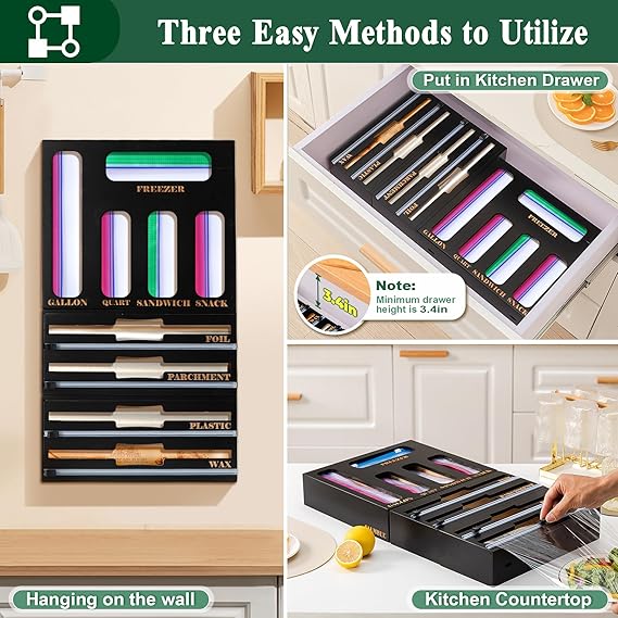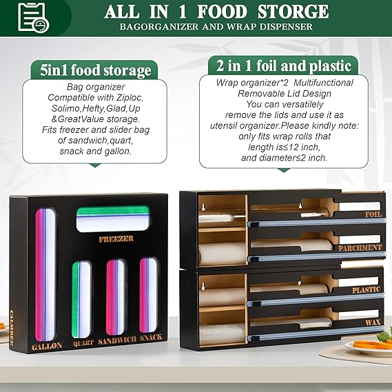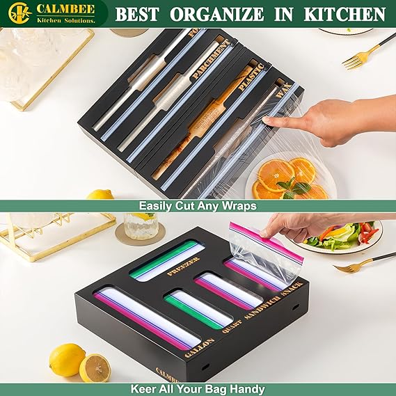 From Messy to Tidy: Are you frustrated with opening the drawers that had the bags and wraps as they would always cause the drawer to get stuck? Here is the solution. Cut the clutter and have a organized kitchen drawer with our ziplock bag organizer and plastic wrap. Your drawer will change to be a organizer’s dream. The ONLY Complete Kitchen Baggie and Foil Dispenser: Calmbee baggie organizer and foil dispenser is the only complete set that can effortlessly organize your kitchen. This set contains 4 in 1 wrap dispenser with cutter, perfect for Aluminum foil, plastic wrap, wax paper. It also comes with 5 in 1 ziplock storage bag organizer, compatible with Ziploc, Solimo, Hefty, Glad, Up&Up & GreatValue storage, freezer and slider bag of sandwich, quart, snack and gallon size. Detachable & Connectable Use: The storage bag organizer is designed to meet your different needs. It can be connected to hang on the wall, or detached to put on your drawer or counter according to your space needs. Organize your different wrap rolls and food storage bag in an more convenient way. Removable Lids Design: You will get more storage space with this clever removal lids design. You can remove the lids and use the dispenser as a kitchen utensil organizer. Effectively make the most of the available space in your kitchen. Built-in Slider Cutter & Label Included: Innovative slide cutter to get the job done quickly and effortlessly! You will just need to pull out the wrap from the dispenser, and then, slide the knob on your dispenser to cut it. Assorted labels included to help you identify your wraps or bags easily.